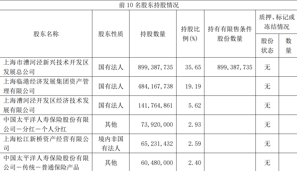 截至2021年三季度末,上海臨港前十大股東