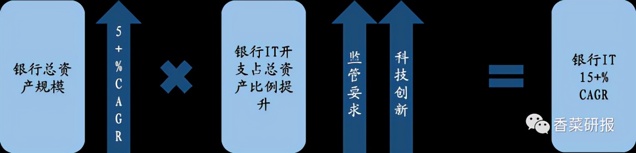 銀行IT投入成長空間增上加增。首先,銀行自身每年以5%以上的增速在成長。監管的新要求以及對金融創新的開放態度,疊加新技術在銀行領域的不斷應用,推升銀行IT開支占總資產的比例不斷向國外同行靠攏。我們預計在二者增速疊加的基礎上,未來我國銀行IT的投入將保持15%的復合增長率。