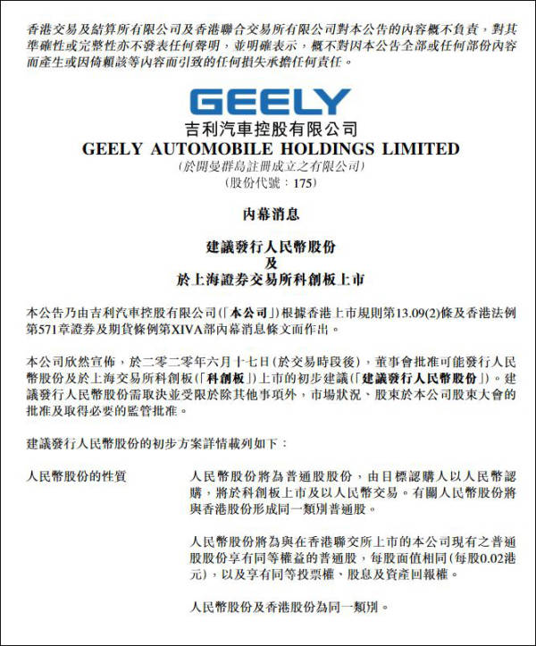 吉利汽車有關回歸A股科創板的公告