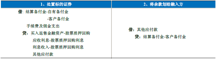 (2)如果標的證券處置所得小于應付金額及相關交易費用,則公司處置標的證券,扣除交易費用后,按照償還股票質押回購款,已計提利息和違約金順序結轉賬務,未償還款確認為融入方的債權,并根據與融入方的后續約定或仲裁、判決結果進行相應的賬務處理,確認無法收回的計提相應減值。