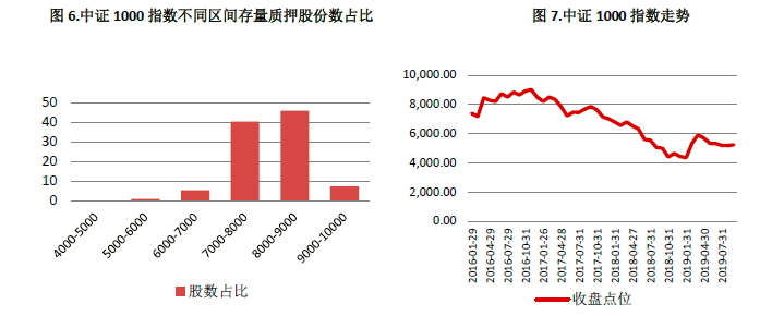市場風險方面,存量質押業務中,中證1000指數[7000,8000]和[8000,9000]區間內開展的股份數占比分別為40%和46%。當平倉線為130%,融資利率為7%,質押率在40%的假設條件下,當市場下跌44%至4500點左右時,53%股票質押業務將面臨平倉風險。2018年以來,中證1000指數不斷下跌,2018年四季度曾一度跌至4400點附近,導致券商股票質押業務風險不斷暴露,隨著2019年以來,市場逐漸回暖,中證1000指數已回升至5000點以上,已脫離集中風險暴露區間,整體風險可控。