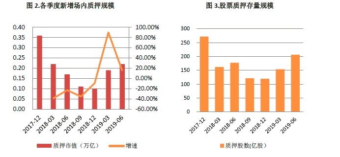 場內質押規模方面,受質押新規影響,2018年1季度新增場內質押規模較2017年4季度大幅下滑,新增股票質押市值降幅達38.77%,新增股數下滑40.59%。2018年資本市場下行,股票質押業務風險逐漸暴露,券商對于股票質押業務開展更加謹慎,2018年4季度新增場內質押股數達到低值。2019年資本市場回暖,從下圖可見2019年以來場內質押又有所回暖趨勢,新增場內質押股數環比增長達28.63%,主要由于2019年初股市處于相對低位,券商開展質押業務的風險可控,部分券商加大質押業務開展力度。