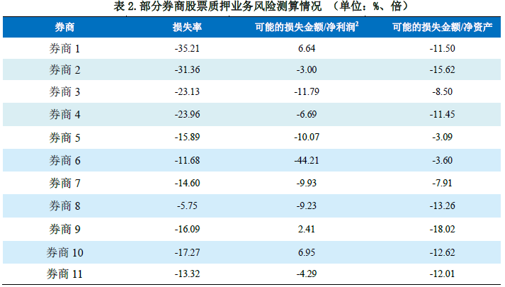 業務質量是券商信用風險管理能力的最明顯體現,可通過以下指標來衡量:1)損失率即可能產生的損失金額占未解押股票市值的比例,該比例越高,表明質押業務的質量越差;2)可能產生的損失金額占凈資產的比例,該比例越高,凈資產被侵蝕風險越大;3)可能產生的損失金額占凈利潤的比例,若該指標超過1,則表明企業或面臨未來年度持續吸收損失的風險。
