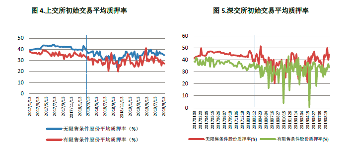 質押率方面,從股權質押迅速發展以來,質押率均處于較高水平,2017年無限售條件股份平均質押率在40%~50%,限售股平均質押率在30%~40%。2018年1月,質押新規發布以來,質押率出現明顯下滑,質押率平均下降超過5%,無限售股份質押率最低降到20%,2018年資本市場表現不佳,券商在開展業務時更加謹慎,質押率保持低位,2019年以來,資本市場有所回暖,質押率也呈現一定小幅上升趨勢。