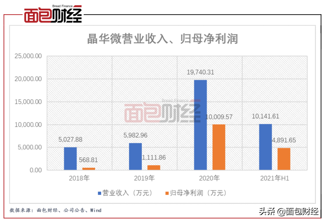 2018年和2019年,公司營收均為5000余萬元且盈利規模相對較小,分別為568.81萬元和1111.86萬元。但到了2020年,晶華微業績大幅增長,其中營收同比增長229.94%、歸母凈利潤同比增長800.26%。
