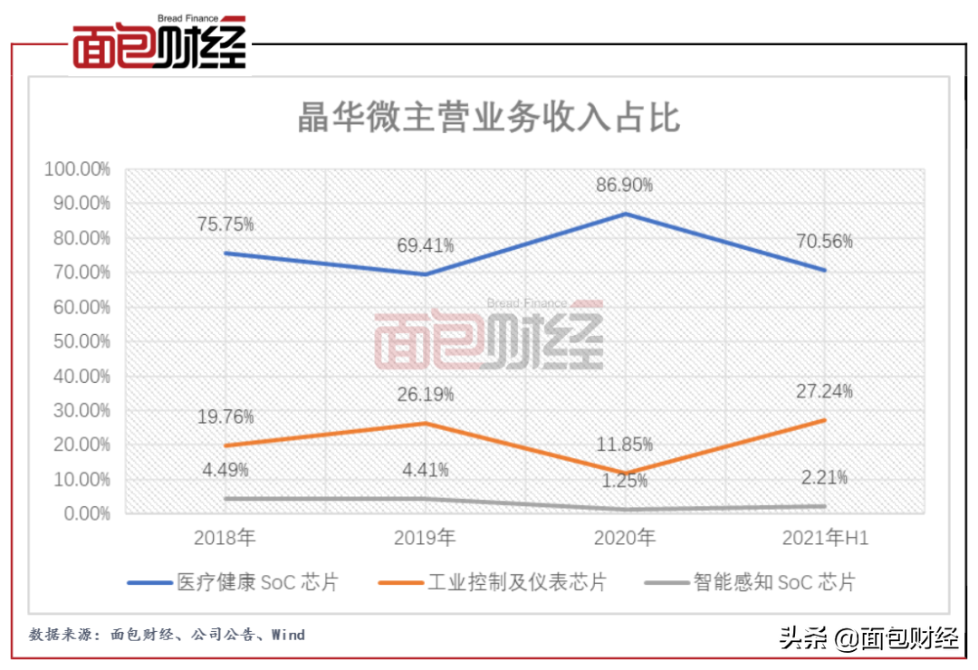 2018年至2021年上半年,晶華微來自于醫療健康SoC芯片的主營業務收入占比均接近或者超過七成。工業控制及儀表芯片是第二大收入來源,2021年上半年的主營業務收入占比為27.24%。