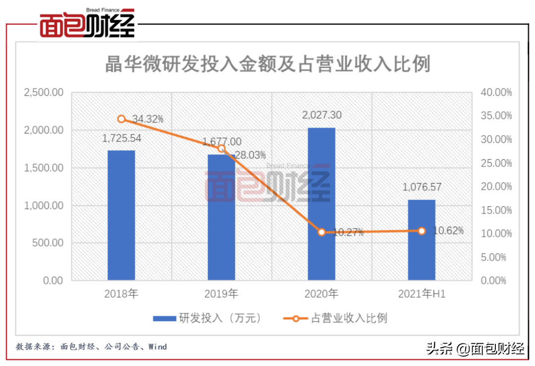 另外值得注意的是,晶華微研發投入占營業收入的比例整體處于下行趨勢,由2018年34.32%下降至2020年10.27%。