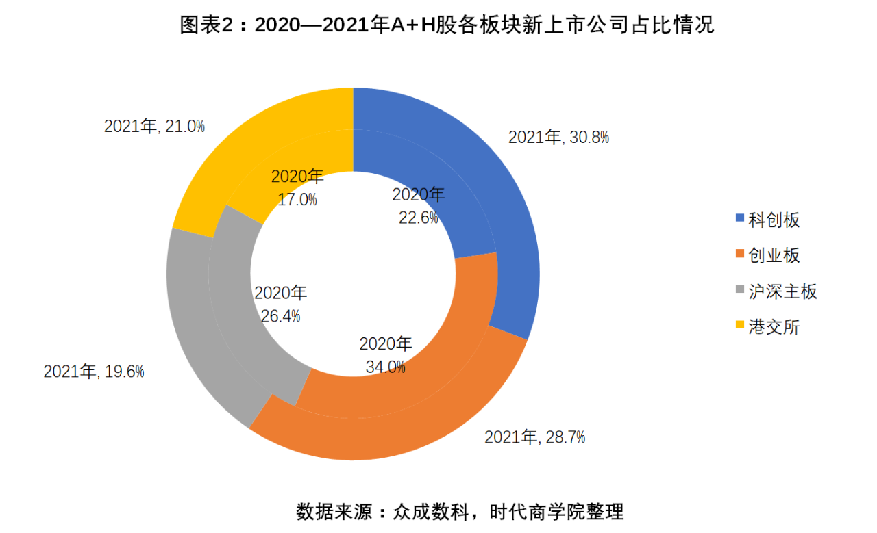 圖表 2:2020—2021年A+H股各板塊新上市公司占比情況