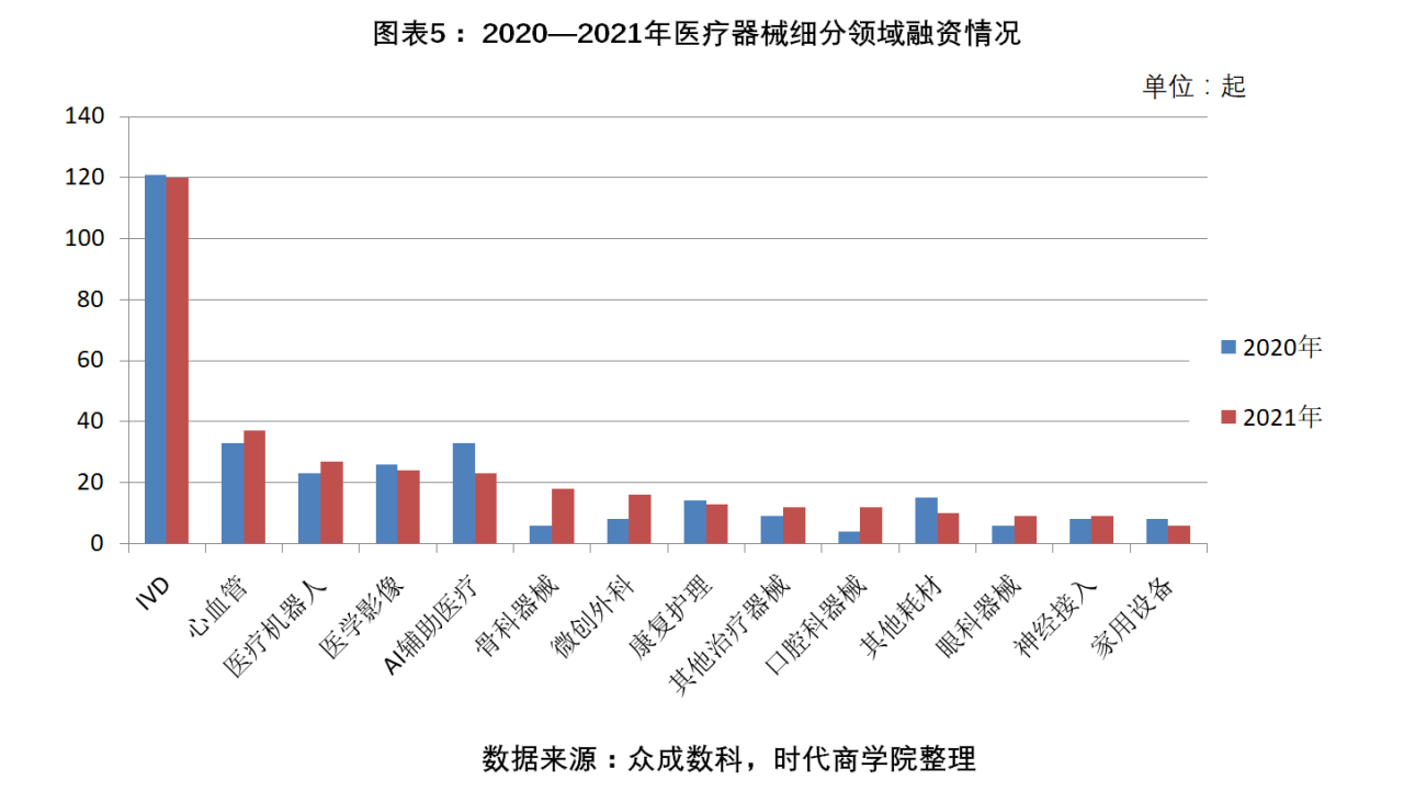 圖表 5:2020—2021年醫療器械細分領域融資情況(單位:起)