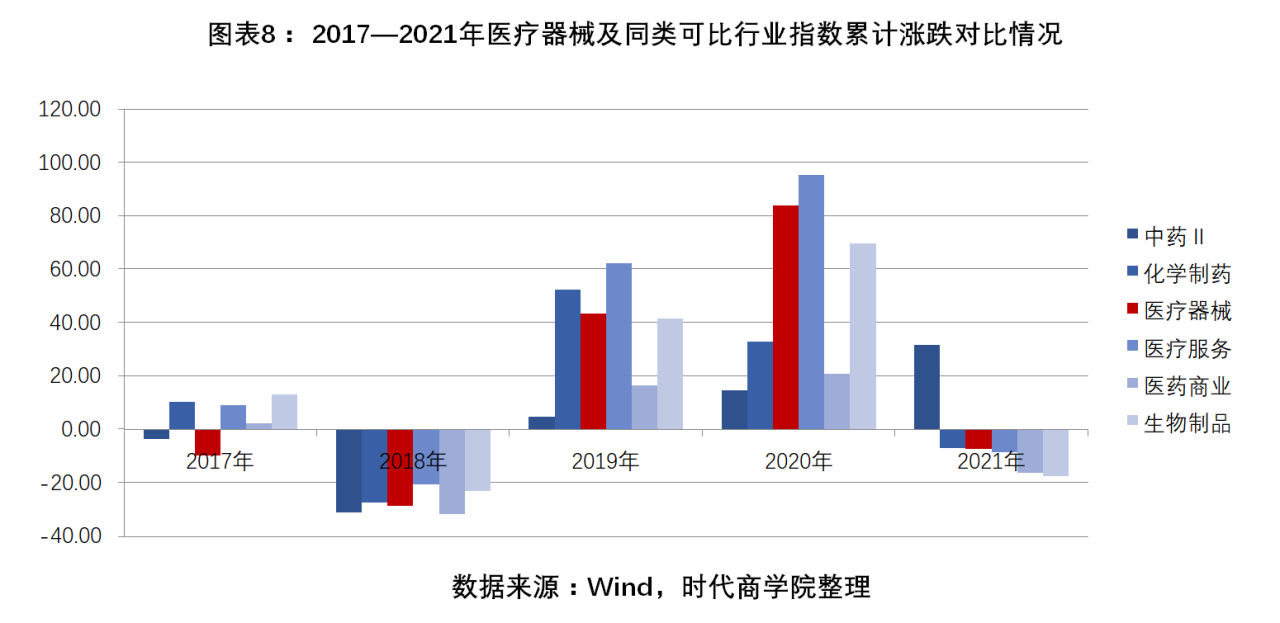 圖表 8:2017—2021年醫療器械及同類可比行業指數累計漲跌對比情況(%)