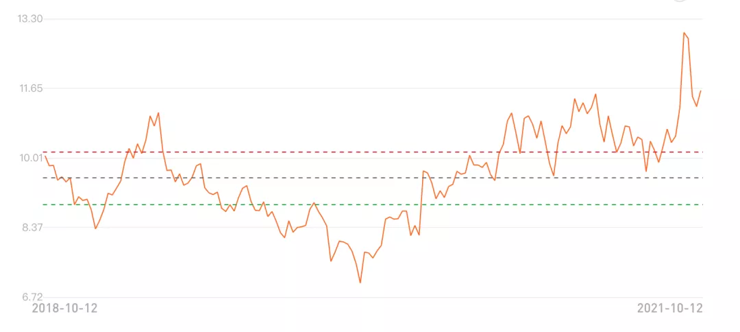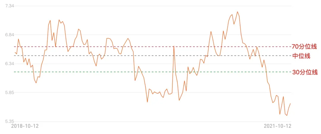 圖中三條線分別是:30分位值,低估意味著較安全;中位值,不高不低;70分位值,高估意味著也許危險。由圖可知,銀行板塊的估值處于三年以來的低位,去年的低點在2020年7月27日,之后開啟了一次為期半年的上漲。