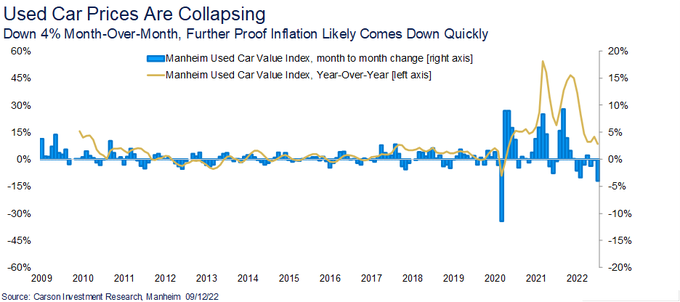 類似的領域還有二手車和酒店業。據的數據,曾在疫情期間飆升的二手車批發價格在8月環比下降了4%,這是有史以來最大的跌幅之一。