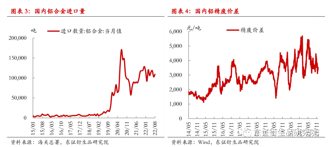 8月國內廢鋁回收量4.7萬噸,同比+16.3%,1-8月累計回收量31.0萬噸,累計同比-7.6%。國內廢鋁供應偏緊總量不及去年同期。8月國內廢鋁進口量17.1萬噸,同比+137.9%,1-8月累計進口95.0萬噸,累計同比+78.9%。8月國內鋁合金進口量10.9萬噸,同比+10.9%,1-8月累計進口88.0萬噸,累計同比+30.8%。年迄今進口廢鋁以及合金錠相對充裕。