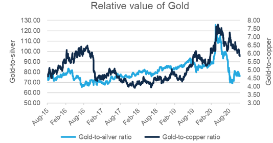 黃金是一個被廣泛認可的衡量標準,金價與其他商品價格的比率是一個有效的指標。例如,黃金與銅的比率顯示全球經濟的相對健康狀況。與黃金不同,銅廣泛運用于工業,通常是經濟活動的風向標。