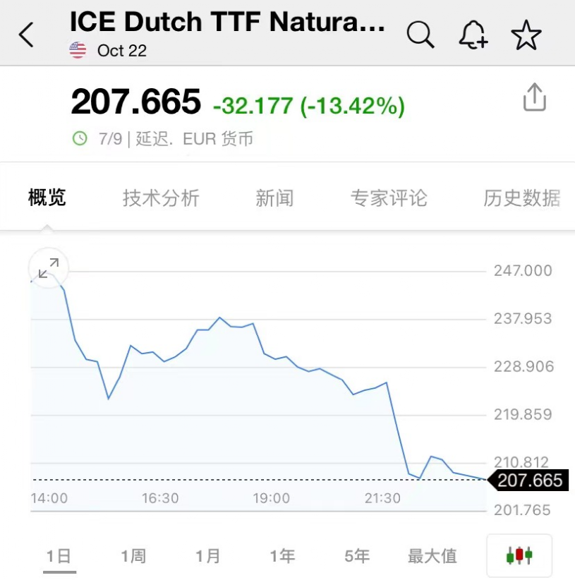 歐美天然氣兩日連跌。歐洲基準TTF荷蘭天然氣10月期貨尾盤跌近11%至214歐元/兆瓦時,盤中最深跌近15%并下逼200歐元整數位,接近一個月新低。目前位于207.665歐元/兆瓦時附近。