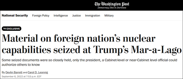 在此之前,《華盛頓郵報》曾報道稱,FBI在特朗普私人莊園搜查的內容中,包括了與核武器有關的“最高機密級別”文件,甚至可能涉及一些比“最高機密”更機密的海外行動材料。