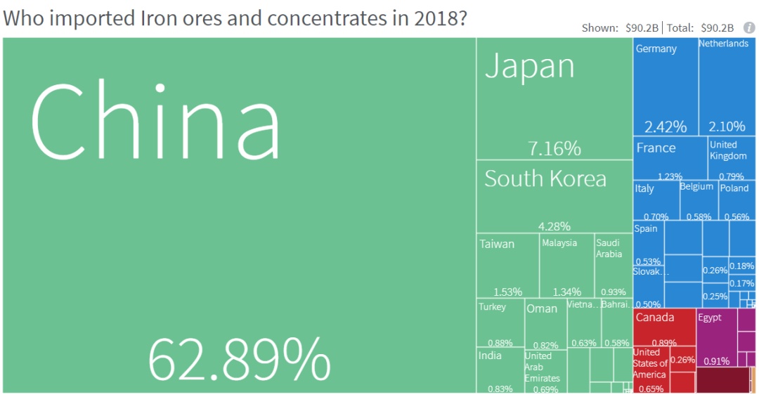 中國2018年鐵礦石進口占全球的62.89%(圖源:)