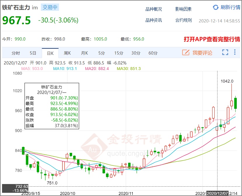 效果同樣立竿見影,12月7日鐵礦石主力合約價格下跌6.02%,但好景不長,周四、周五連續兩天能大漲,鐵礦石價格再創新高,本次價格下跌可能也是暫時回落。