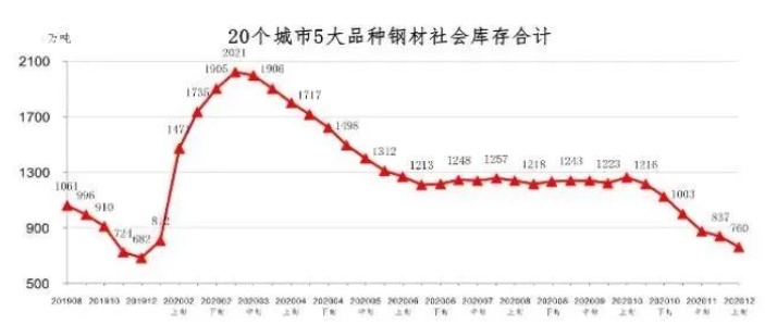 根據中國鋼鐵工業協會市場調研部的最新報告顯示,12月上旬,20個城市5大品種鋼材社會庫存僅為760萬噸,與今年3月上旬峰值2021萬噸相比,下降62.4%。