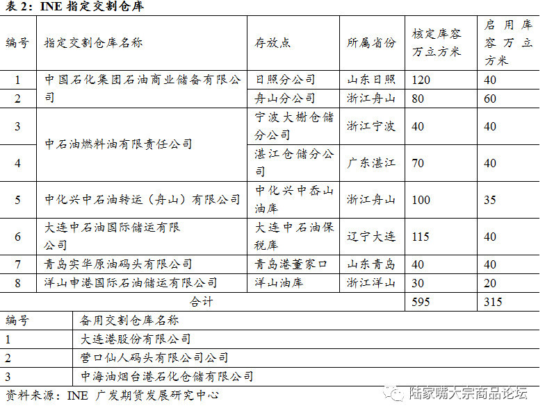 目前INE(上海國際能源交易中心)原油期貨交割庫有8個,分別位于遼寧(1個)、山東(2個)、上海(1個)、浙江(3個)、廣東(1個)。總庫容595立方米,啟用庫容315立方米。此外,能源中心還設立了三個備用交割倉庫。交割倉庫之間不設升貼水。