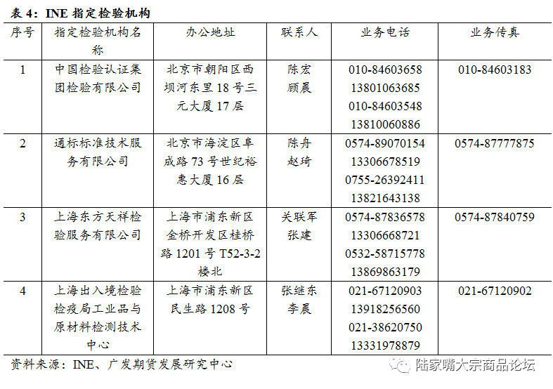 目前INE公布的首批指定質檢機構包括四家,分別是中國檢驗認證集團檢驗有限公司、通標標準技術服務有限公司、上海東方天祥檢驗服務有限公司、上海出入境檢驗檢疫局工業品與原材料檢測技術中心。下表列明了質檢機構的詳細情況。