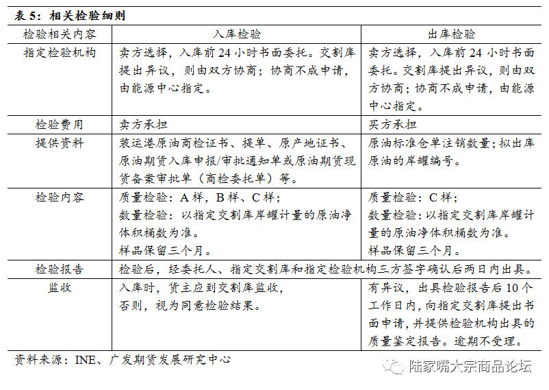 根據《上海國際能源交易中心交割細則》規定,期貨商品入出庫檢驗以指定檢驗機構按照期貨品種對應的檢驗細則所載明的檢驗指標和方法檢驗為準。入庫時檢驗機構由賣方在能源中心指定檢驗機構中選擇,出庫時由買方在能源中心指定檢驗機構中選擇。入庫時的檢驗費用由賣方承擔,出庫時的檢驗費用由買方承擔。下表列明了原油交割入出庫檢驗過程中重點需要關注的相關內容。根據《上海國際能源交易中心交割細則》規定,期貨商品入出庫檢驗以指定檢驗機構按照期貨品種對應的檢驗細則所載明的檢驗指標和方法檢驗為準。入庫時檢驗機構由賣方在能源中心指定檢驗機構中選擇,出庫時由買方在能源中心指定檢驗機構中選擇。入庫時的檢驗費用由賣方承擔,出庫時的檢驗費用由買方承擔。下表列明了原油交割入出庫檢驗過程中重點需要關注的相關內容