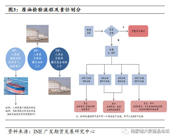 對于檢驗結果的責任劃分,《上海國際能源交易中心交割細則》作了明確規定。如果C樣合格,則表明入庫原油符合質量要求。反之,如果C樣不合格,則需要分別對A樣和B樣進行質量檢驗,檢驗結果有四種不同的情況,具體取樣和責任劃分如下圖所示。