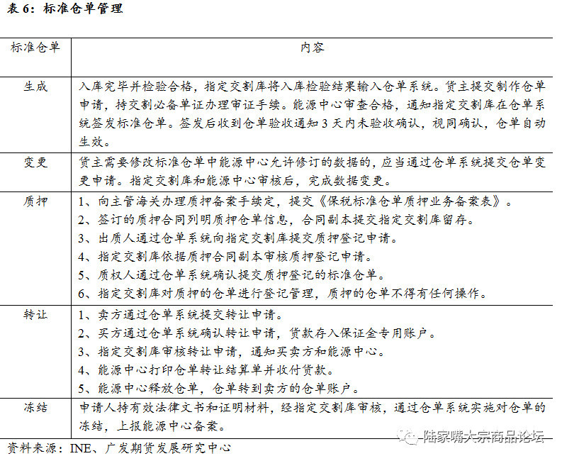 倉單交割是我國原油期貨交割的特有的方式,通過倉單的流轉完成貨物所有權的轉移也極大的方便了買賣雙方的交易。倉單交割中最重要的當屬標準倉單的生成和使用。標準倉單是在標準倉單管理系統中生成的以電子形式存在的提貨單,具體包括下列事項: