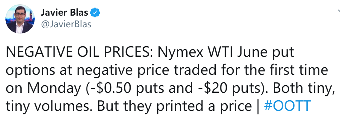 彭博首席能源記者哈維爾·布拉斯( Blas)指出,根據的數據,6月到期的WTI原油看跌期權周一首次出現負數交易價格。