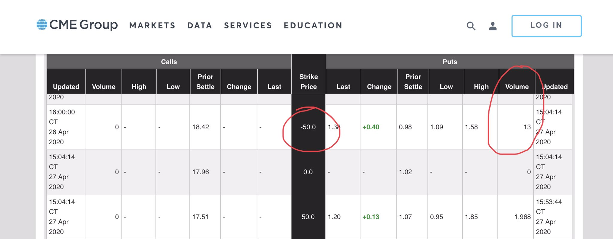 昨日有13手看跌期權合約行權價為負數,也就是說WTI期權有史以來第一次以負價交易。雖然這些負價交易的期權量很少,但意義卻重大。