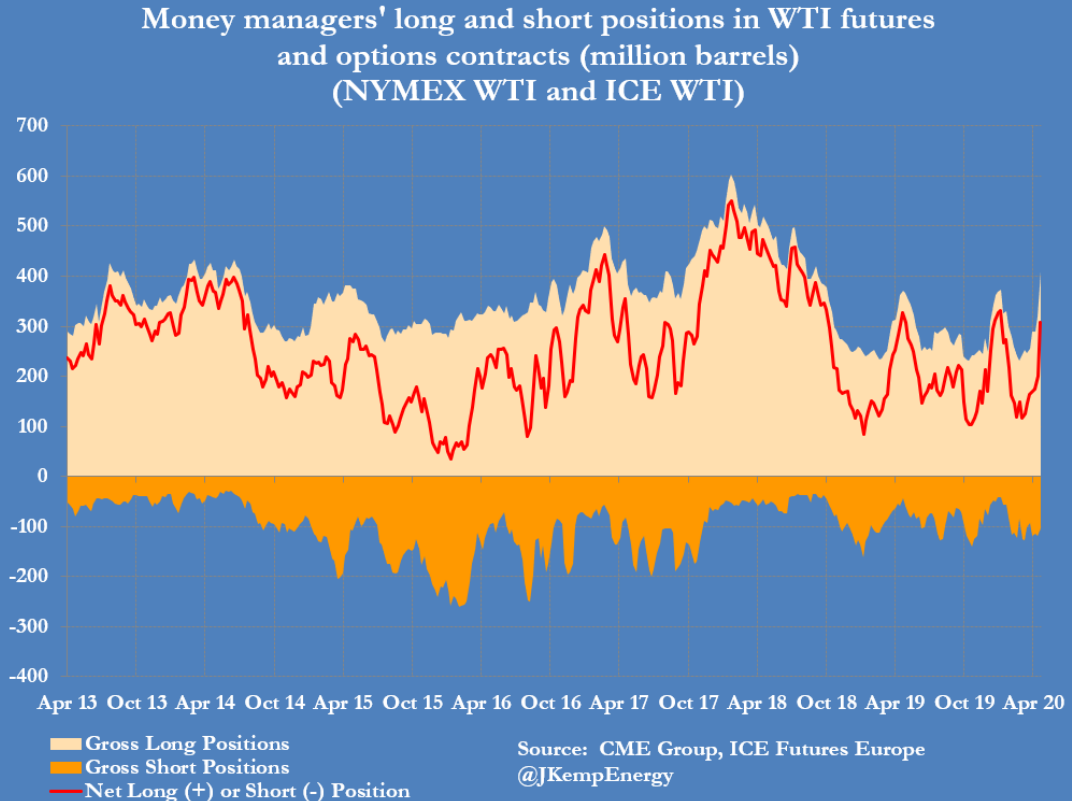 WTI的買盤似乎反映了基金經理們的盤算:盡管庫容即將耗盡且油價有再次暴跌的風險,但價格如此之低,風險更偏向于上行。