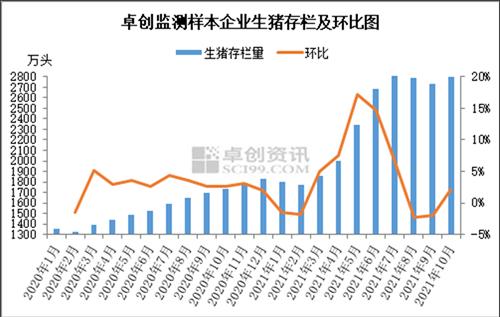 月底前來看玉米價格仍然存在提漲概率,目前深加工企業需求較為穩定,據卓創資訊統計東北地區、山東、河南、河北共計45家深加工企業,其9-11月份平均庫存天數維持在15天左右,并未出現較大幅度的增長或減少。深加工需求雖然穩定,但飼料需求方面卻存在一定的供應缺口,據卓創資訊統計,2021年8-10月份我國生豬存欄量基本穩定(見下圖),但目前飼料企業庫存天數保持低位,一旦北方降雪阻滯交通運輸,飼料企業對玉米需求的缺口便會更加突出,對玉米價格作出漲價判斷的依據便來源于此。