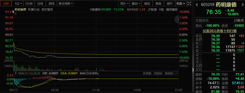 CRO概念股集體大跌,康龍化成大幅下挫近15%,藥石科技跌超10%,總市值超2000億元的龍頭股藥明康德跌停,凱萊英同樣跌停,博騰股份跌超9%,泰格醫藥盤中最高跌超9%。港股方面,2300多億港元市值的藥明生物一度跌超20%。