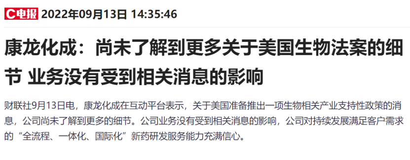 對此,有媒體記者今天以投資者身份致電凱萊英證券事務部,相關公司人員回應:大跌或許是市場對于潛在風險的擔憂,但目前看,公司與美國的合作是在小分子化學藥領域的CDMO訂單,沒有生物藥方面的合作。