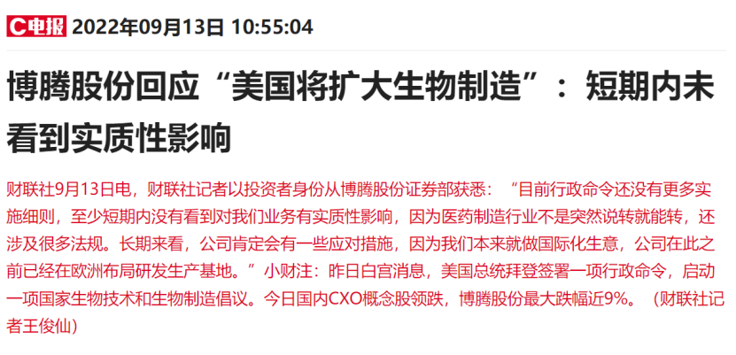 同時,財聯社記者以投資者身份從博騰股份證券部獲悉:“目前行政命令還沒有更多實施細則,至少短期內沒有看到對我們業務有實質性影響,因為醫藥制造行業不是突然說轉就能轉,還涉及很多法規。長期來看,公司肯定會有一些應對措施,因為我們本來就做國際化生意,公司在此之前已經在歐洲布局研發生產基地。”