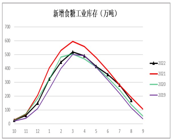截至8月底,全國累計銷售食糖788萬噸,同比減少88.45萬噸,累計銷糖率82.5%,同比增加0.33%;全國制糖工業企業成品累計平均銷售價格5778元/噸,8月成品白糖平均銷售價格5747元/噸。