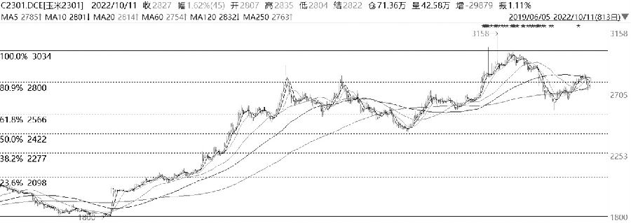 4月底,玉米期價見頂后大幅回落,跌至黃金分割0.618對應的2566元/噸支撐位才止跌。7月底以來,期貨主力2301合約重拾漲勢,站上60日均線,并且短期均線拐頭向上,有重新組成多頭排列的跡象。此外,MACD指標高位死叉后,近期出現金叉的跡象,走勢有望轉強;KDJ指標、RSI指標均金叉,顯示短期走勢偏強。量倉方面,7月底以來的反彈伴隨著增倉放量,說明多頭主動進場支撐價格,但近期的反彈出現減倉情況,說明價格回升有可能是空頭回補所致,上漲動能有減弱的跡象。