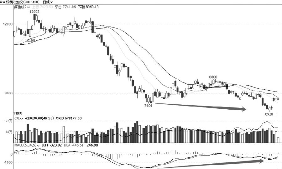 從棕櫚油加權日線走勢圖可以看出,棕櫚油自4月28日見頂12602元/噸直至9月29日見底6920元/噸走了一個完整5浪的單邊下跌趨勢,并且7月14日的低點7404元/噸與9月29日的低點6920元/噸形成了一個明顯的大跨度的MACD指標底部背離形態。