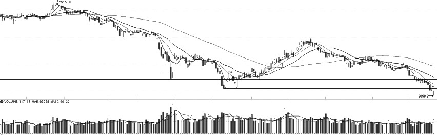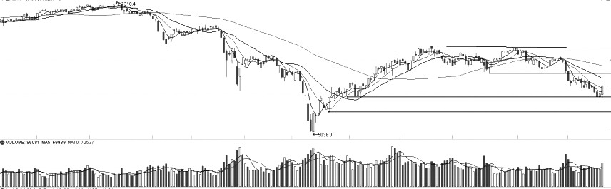 IF加權周初呈現加速探底之勢,并在周三K線上留下一條長下影線的倒垂陽線,表明IF加權在再創年內低點之際,下方具有較強的承接能力。均線方面,MA5依然是短期重要的移動壓力線,且均線系統延續空頭排列,后續重點關注短期均線修復情況。指標方面,MACD綠柱收窄,但DIF與DEA仍然在零軸之下,表明IF加權向下的動能衰竭。整體上看,IF加權出現穿頭破腳的標志性K線組合后,階段性低點已經顯現。