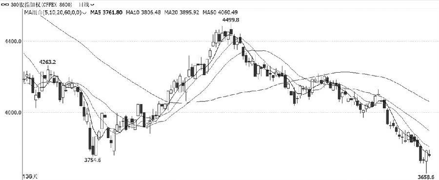IF加權周三收成長下影線形態的K線,其伴隨著成交量明顯放大,持倉量有所增加,短線止跌跡象較為明顯。指標方面,均線系統延續空頭排列,MACD指標快慢線跟隨價格繼續走弱,技術指標還沒有明顯反轉信號。綜合來看,IF加權本周價格跌破前期4月低點一線后繼續走弱,短線雖有所止跌,但技術形態整體仍舊偏弱,不宜過早進行抄底操作。
