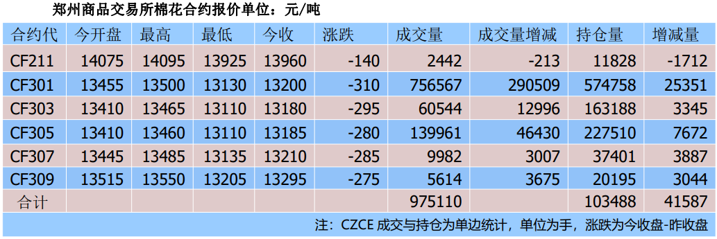 美國EMOTM到港價97.1美分/磅(-4.2);巴西M到港價97.6美分/磅(-4.2)。10月20日中央儲備棉輪入上市數量6000噸,實際成交2000噸,成交率33%。今日平均成交價為15920元/噸,較前一日下跌17元/噸。