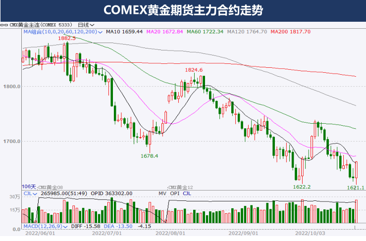 COMEX黃金經歷大幅反彈后又持續下跌,上方仍有多根均線形成空頭排列價格在1700美元面臨阻力,1600美元附近或形成雙底支撐。
