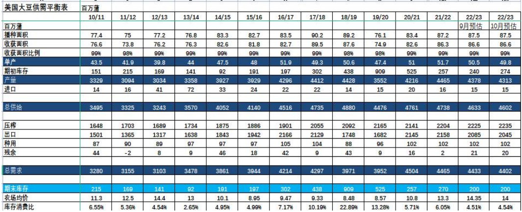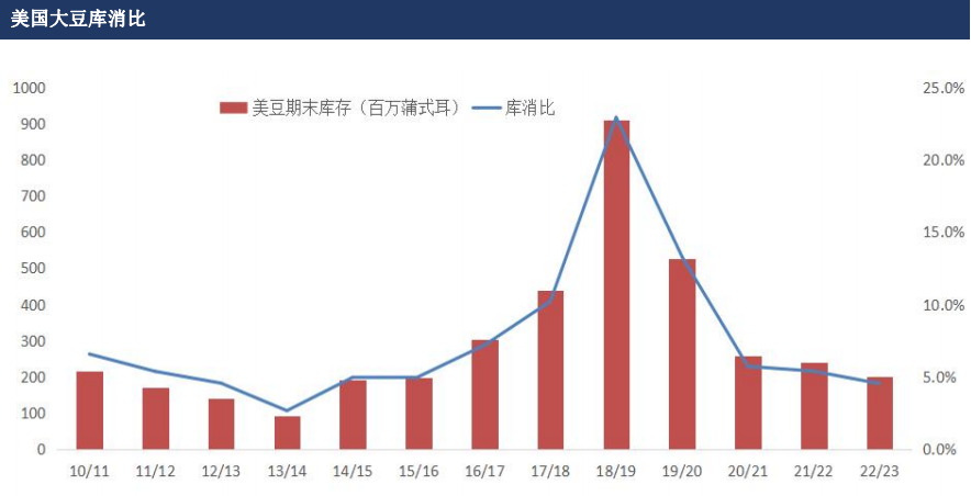 2021/22年度美豆庫存2.7億蒲式耳,新季2022/23年度美豆庫存維持2億蒲式耳,庫存處于偏低水平。