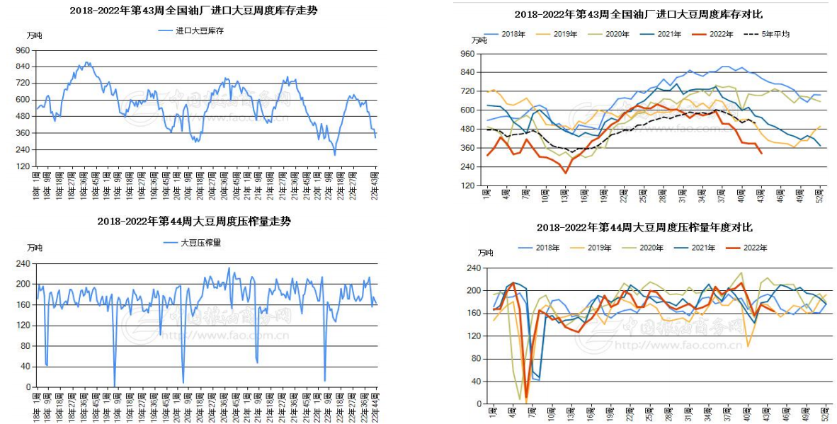 截至10月27日,進口大豆盤面壓榨利潤仍然較差,其中:美灣11月船期盤面榨利分別為-697元/噸。巴西3船期盤面榨利分別為-559元/噸。