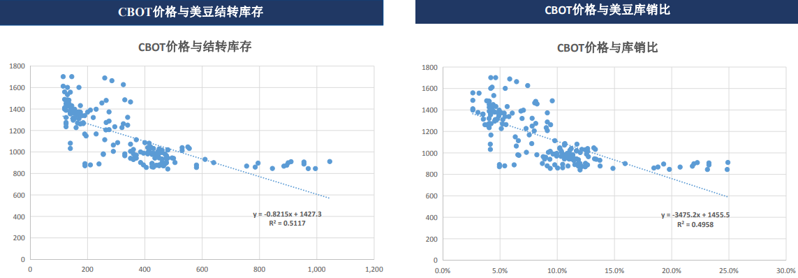 通過對近10年USDA每個月公布的的結轉庫存和庫銷比的值,和該月的CBOT指數價格進行回歸,我們得出散點圖如下面兩圖所示。