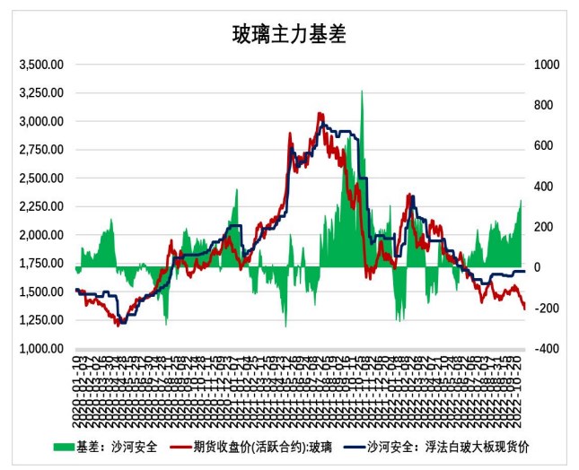 2、基差:浮法玻璃現貨基準地河北沙河安全現貨1676元/噸,FG2301收盤價為1358元/噸,基差為318元,期貨貼水現貨;偏多。