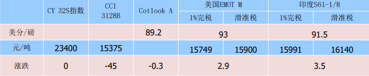 美國EMOTM到港價93美分/磅(+2.9);巴西M到港價94.3美分/磅(+3)。11月2日中央儲備棉輪入上市數量6000噸,實際成交1920噸,成交率32%。今日平均成交價為15392元/噸,較前一日下跌62元/噸。