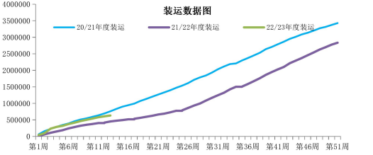 據美國農業部公布的美棉周度出口數據顯示,截至11月3日當周,美國2022/23年度陸地棉凈簽約33067噸,較前一周減少24%;裝運陸地棉24517噸,較前一周減少9%。美棉出口數據環比有所下降。截至2022年11月3日,美國累計凈簽約出口2022/23年度棉花201.4萬噸,達到年度預期出口量的73.99%,累計裝運棉花63.5萬噸,裝運率31.50%。其中陸地棉簽約量為199.0萬噸,裝運62.9萬噸,裝運率31.61%。皮馬棉簽約量為2.4萬噸,裝運0.5萬噸,裝運率22.75%。