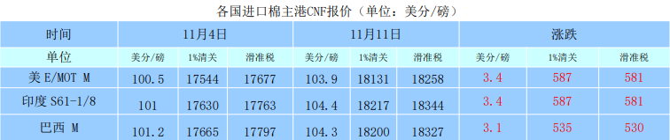 截至11月11日CRB大宗商品價格指數小幅上漲,11月11日收盤報287.55,較11月4日累計上漲6.89,漲幅為2.5%。國內文華商品指數11月11日收盤報191.76,較11月4日上漲2.88,漲幅為1.52%。11月11日,ICE期棉主力12合約報87.99美分/磅,較11月4日上漲0.94美分/磅,漲幅1.08%。