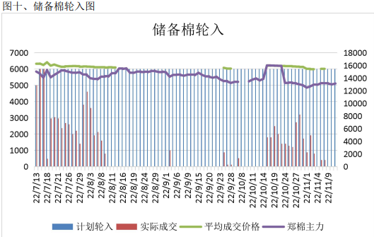 截至11月11日當周鄭棉主力01合約周五收盤報13300元/噸,較11月4日累計上漲115元/噸,漲幅為0.87%,持倉累計減少2.9萬手,至51.1萬手。本周商品市場整體表現亮眼,更多的是受到宏觀層面的影響,美國通脹顯著下滑,令市場預期后續的加息政策或將轉向溫和。國家衛建委對于防疫政策的轉變給市場帶來情緒利好,股市及商品市場強勢上漲。在優化二十條防疫舉措發布后,昨日烏魯木齊針對404個風險地區進行調整,其中有208個高風險小區被降為低風險小區。從產業端的角度來看,11月11日,結束了2022年度第一批中央儲備棉輪入。輪入總量為50.3萬噸,成交量8.67萬噸,成交率17%。但在公告中表示,“后續將根據棉花市場調控需要和新棉收購形勢等,擇機啟動第二批中央儲備棉輪入”。給市場留有一定想象空間。